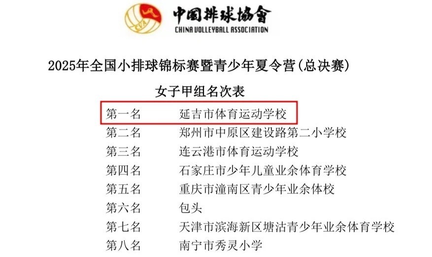 记者从延吉市文化广播电视和旅游局(体育局)了解到,延吉市青少年业余体育运动学校排球队获2025全国小排球锦标赛女子甲组总决赛冠军。